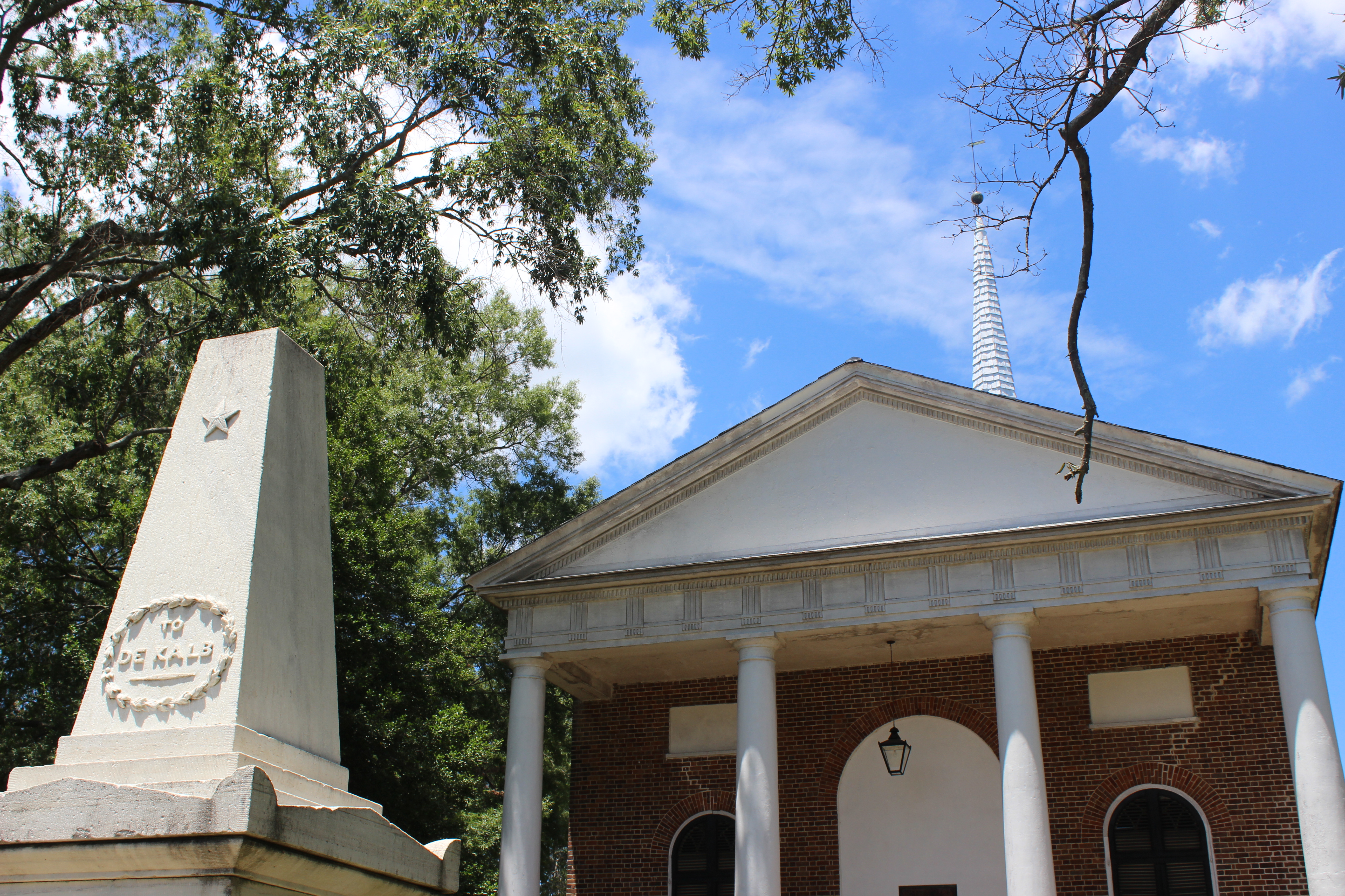 In 1825 de Kalb’s remains were exhumed and reinterred in its present spot; Bethesda Presbyterian Churchyard. Robert Mills, well-known as the architect for the Washington Monument, was responsible for the current monument to the Bavarian.