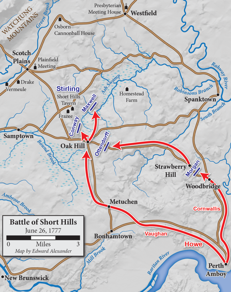 British forces under General Cornwallis left Perth Amboy at one o’clock in the morning on June 25, 1777. They engaged the Americans in the Battle of Short Hills, near the modern Union/Middlesex County Line. Another column, led by General John Vaughan, accompanied by General William Howe, moved toward New Brunswick then turned north toward Scotch Plains by a more southerly route. They planned to destroy Stirling’s isolated division between the two wings, and force Washington into an engagement. Stirling had two brigades, Brigadier General Thomas Conway’s Pennsylvanians and Brigadier General William Maxwell’s New Jersey troops. In all Stirling had about 1,798 men, more than 16,000 were bearing down on him.