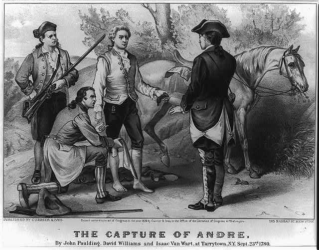 Major Andre cautiously rode his horse through unfamiliar territory between American and British lines. It was a neutral zone wreathing with unforgiving bands of Cowboys and Skinners, but ground that Andre, garbed in civilian clothing, needed to cross in order to return to New York City. He had experienced several close brushes with American posts, and his guide, Joshua Smith, rather than risking any run-ins with Tories, had decided to turn around when they were some twenty miles from British lines. Andre was on his own for the final leg of the journey. All seemed to be going well until he arrived just outside of Tarrytown and three men with leveled muskets emerged from the bushes astride the path.