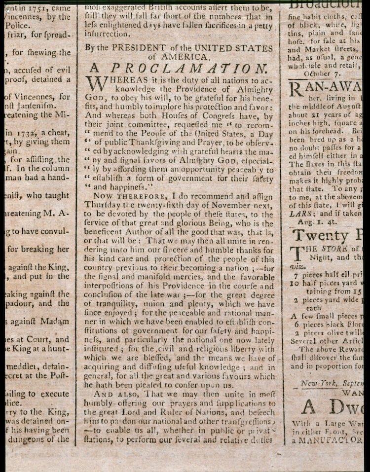 On October 3, 1789, President George Washington issued a “Thanksgiving Proclamation” to the people of the United States. In this declaration, Washington designated “Thursday, the 26th day of November” to “the People of the United States a day of public thanks-giving.”