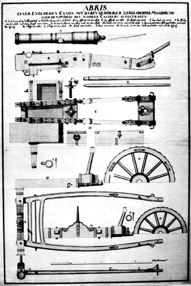 Thanks to the Germans there is information for a British six-pounder field gun limber. The Germans made a detailed drawing of the British six-pounder field gun carriage and limber used during the Seven Years War. That type six-pounder gun with limber was likely used by Alexander Hamilton at Trenton, and George Rogers Clark at the Battle of Peckuwe. It is noteworthy that the limber wheel diameter is 36 inches. William Congreve complained that these light field gun limbers had, “Wheels are so low that the Axletree often drags upon the Ground in bad roads.” He also complained, “The Naves of the Limber Wheels are too small to admit of their being put upon the Axletree of the Gun Carriage.”[i]