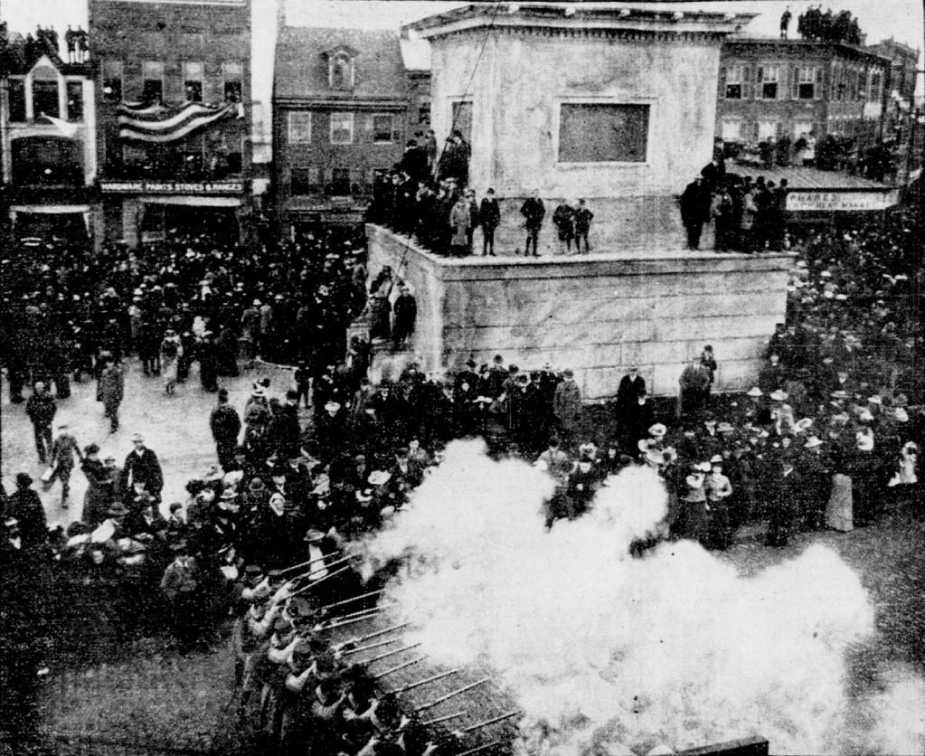 January 3 was a cold clear day, but there was more than a foot of snow on the ground. The troops paraded out of Princeton south to the site of the old battleground. The “Continentals” marched first and were followed by the “British.” On account of the snow, they didn’t make it all the way to the original battleground where the Mercer oak marked the traditional location where General Hugh Mercer was dragged to after being bayoneted. Instead, they stopped a little closer to the town and engaged each other in the sham battle. The men portraying Mercer’s brigade were driven back by the “British” and the man portraying Mercer fell to the ground “mortally wounded.” As The Sun noted, “Just then Gen. Drake, in imitation or Washington, appeared above the crest, leading the Philadelphians.” In dramatic fashion, the “Continentals” drove the “British” back onto the road and up into the town. The sham battle continued up around Nassau Hall, where the “British” finally surrendered ending the battle. The day ended with a feast for the participants.
