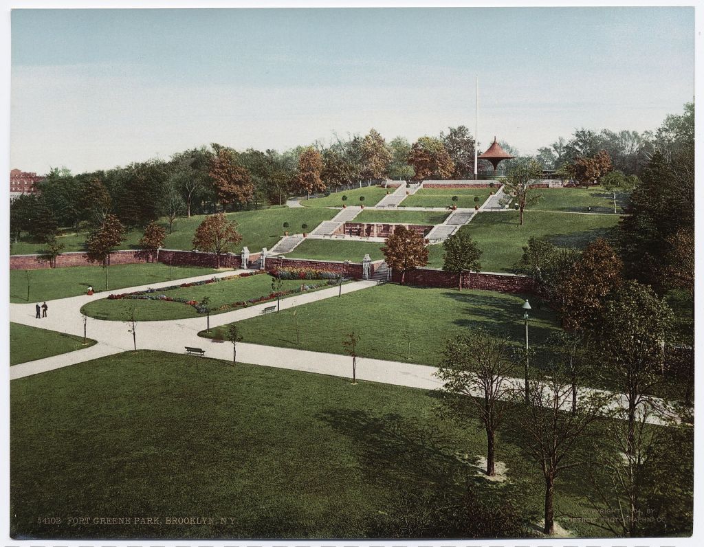 In November 1865 seven months after Appomattox Frederick Law Olmsted returned to New York City eager to resume the landscape architecture partnership he enjoyed with his London-born colleague Calvert Vaux. Olmsted had done much for the Union cause with his work as secretary of the United States Sanitary Commission. Burned out, Olmsted resigned after the Battle of Gettysburg and took a job with a mining concern in California, as far away as he could get from the fighting within the continental United States. Prior to the war he and Vaux had built Manhattan’s Central Park, and now civic leaders in Brooklyn asked for a green space of their own. Olmsted and Vaux commenced work on Prospect Park, and began too on another Brooklyn project: the remodeling of Washington Park that would include a crypt for the prison ship martyrs. Washington Park was an ideal location for the martyrs to rest. For one thing it stood atop what had been a fortification during both wars against the British. Indeed from the time of the its construction in 1847 many Brooklynites continued calling Washington Park “Fort Greene” after Major-General Nathanael Greene, who besides much else had done so much to secure the topography during the Revolution. (Eventually the name would officially be changed to Fort Greene Park.) It was a verdant piece of land close to Wallabout Bay and with scenic vistas of the East River and Manhattan. In 1867 the city of Brooklyn gave the Martys’ Monument Association a portion of Washington Park to entomb the remains.[ix]