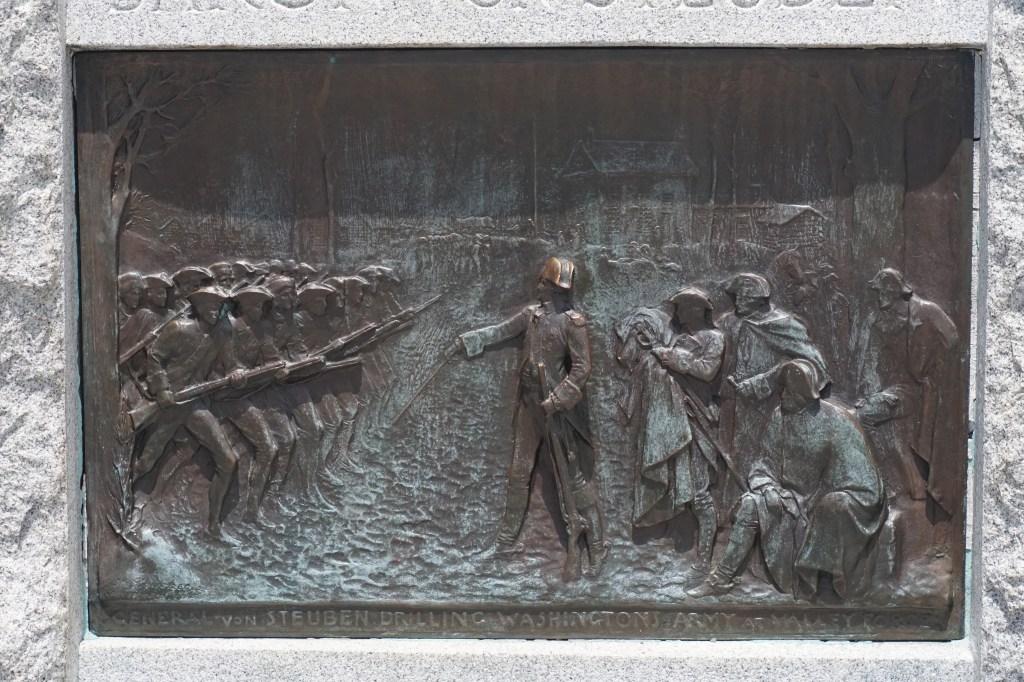The Alliance chose Jakob Otto Schweizer to design the Steuben monument in Utica and called upon him again to sculpt an exact replica for Valley Forge. Schweizer was a Swiss immigrant and proud member of the German Society of Pennsylvania. His sculpture of Peter Muhlenberg (now located in the Philadelphia Museum of Art) caught the attention of a national audience. In accordance with the NGAA’s wishes, Schweizer reproduced his Utica statue almost down to its exact height and width. The only addition he made was a bronze relief depicting Steuben drilling the Continental army. Schweizer honored Steuben’s well-documented sternness in his sculpt. The general looks out upon the fields of Valley Forge with an expression that “reflects determination, but not harshness.”[2]