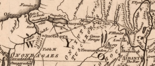 Oswego was the entrance to a system of waterways that connected Lake Ontario [left] with Albany, New York [lower right]. A British force under St. Ledger in 1777 had moved east from Oswego with the goal of joining forces with General Burgoyne in Albany. If successful they potentially could have driven a wedge between New England and the other rebellious colonies. But Burgoyne was defeated at Saratoga and St. Ledger was driven back at Fort Stanwix.