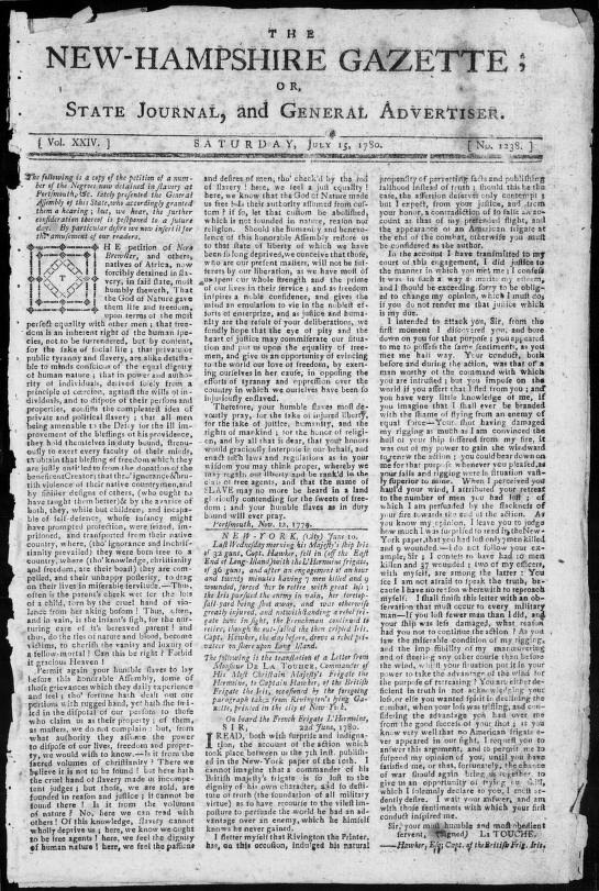 There is an interesting footnote to this story. The New Hampshire government did not conduct any hearings in 1779. Instead, the House of Representatives chose to publish the text of the petition in the New Hampshire Gazette in July 1780, a move calculated, perhaps, more to ridicule the twenty petitioners than act on the petition. As mentioned above, William Whipple manumitted Prince in 1781. In 1857, the New Hampshire state government implicitly abolished slavery by declaring, “No person, because of decent (sic), should be disqualified from becoming a citizen of the state,” later explicitly endorsing an end to slavery when New Hampshire ratified the 13th Amendment to the U.S. Constitution on July 1, 1865.16 On July 7, 2013, New Hampshire’s governor signed into law a bill posthumously emancipating the fourteen African-American petitioners who had not been freed by their enslavers (six were freed during their lifetimes).17 More than 233 years after the petition, the New Hampshire government finally responded to Prince Whipple’s petition and freed the petitioners.