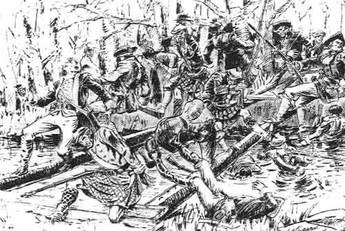 “By letters from North Carolina, we have the pleasure to communicate the following important intelligence, giving an account of the total defeat of the Scotch Highlanders, Regulators, &c. who had lately become very formidable, and threatened much mischief to the southern colonies, as well as to the glorious cause wherein all America is engaged, in support of her invaded rights, and to oppose ministerial tyranny; so that we may now safely congratulate the publick on the utter demolition of the Tory interest in that province, which puts a finishing stroke to the farther machinations of master Martin, their wicked and unprincipled governour.—-Col. Moore, with a body of 2000 men, having got within about six miles of the Tory army, before they thought we were apprised of their scheme to join governour Martin and the succours he expected from Boston and England, they, to amuse him, sent a flag of truce, summoning him and his followers to lay down their arms, deliver up their ammunition and stores, and repair to the king’s standard and take the oath of allegiance; and in the meanwhile, in order to avoid him, they crossed the river, not knowing that col. Caswell was on his way up, on the same side, to join col. Moore, with about 700 men. The colonel, being made acquainted with this manœuvre of the Tories, immediately despatched an express to col. Caswell, who made a forced march, and got near five miles ahead of them, taking post between them and the governour, at a bridge over Moore’s creek, where he knew they must pass, or fall in with col. Moore’s main body. Col. Caswell, making use of his advantageous situation, threw up a Small intrenchment on the oppoſite side of the creek, where he determined to wait for col. Moore, then between 40 and 50 miles distant, or, should the Tories incline to attack him, to give them battle, although they were upwards of 2000 strong. In the meanwhile, however, to decoy them, he made a final breastwork on the other side of the creek, and began to treat with the Tories, who had sent in a flag of truce, with the like requisition they made to col. Moore, to lay down their arms, &c. in which case they should receive mercy, and be treated with gentleness. Col. Caswell’s reply was, that he and his people were resolved to use their arms in the service of their country, and should not lay them down unless they were compelled to it. During this negotiation, he took care to let the officers who came with the flag of truce see his encampment, and the breastwork he had thrown up; and immediately on their departure caused it to be levelled, and crossed to his main post, leaving only a small guard behind, whom he ordered to keep up large fires, as if his whole army was there encamped. He did not fail to leave behind him all the marks of a precipitate retreat, taking up the planks of the bridge for about 30 feet, but suffered the sleepers to remain, that the enemy might have it in their power to come over, though but slowly, and then made dispositions to prevent his army from being discovered by them. Next morning, a good while before day, the whole Tory army marched down to attack him, leaving only a small party behind to guard their baggage. Their disposition was a very good one, the main body being supported on each side by a column of flankers; the van led by col. Macleod, second in command, and the rear of the army brought up by brigadier-general Macdonald, both of whom were at the battle of Lexington, and afterwards sent by general Gage, at governour Martin’s request, to head the North Carolina insurgents. Upon their arrival, finding that col. Caswell had abandoned his camp, they determined to cross the bridge in pursuit of him; but as soon as they got upon it, his advanced guard challenged them, who were answered by Macleod with a discharge of his piece, which a sentinel returned. The enemy then began a heavy firing, although without being able to do the least execution; for col. Caswell lay still, till he thought a sufficient number of them had crossed to play upon with four field-pieces, which he caused to be loaded with musket balls, and were so disposed on the intrenchment (in the form of a half-moon) as to rake the bridge on all sides. About 100 of the enemy having crossed the bridge, there ensued a most dreadful carnage, and they never fired a shot after the first discharge from the artillery, but, being seized with a panick, betook themselves to flight, in the most precipitate manner, notwithstanding every exertion of col. Macleod, who fell soon afterwards, and when found had 23 balls and two buck shot in him and through him. It is supposed that scarcely one of those returned who got over the bridge, about 30 being killed on the spot, between 50 and 60 wounded, and the rest fell over the bridge and were drowned, owing to the planks and sleepers being greased, which served to trip up their hells in their tumultuous flight, as was expected, and intended. A party of horsemen were sent in pursuit of general McDonald, who took him; and the Granville and Orange militia, who were likewise ordered to pursue the enemy, took about 400 prisoners, 30 of them officers, whom they delivered to col. Alexander Martin, then on his march from the western parts of the province to join col. Moore with 4000 men. The private men he disarmed, and set at liberty; but the leaders are to be sent to Halifax, where the Provincial Congress meets the second of April … Providence, which hitherto has so remarkably interposed in our behalf, was upon this occasion equally favourable to our glorious cause; for, during the whole engagement, there was not a single man killed, and only three were wounded, but not badly.”