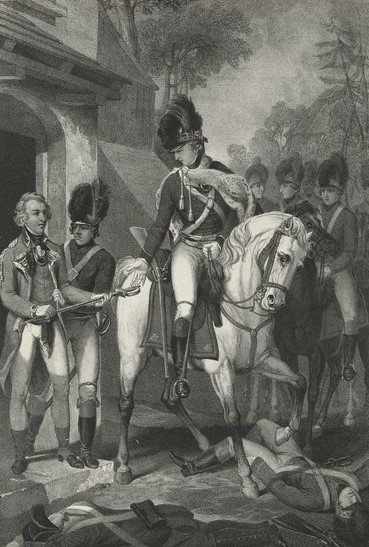 During the Battle of Monmouth Courthouse, fought June 28, 1778, Laurens was sent ahead of the army early in the morning to assist Baron von Steuben in reconnoitering the British Army’s position around the village. The party was fired upon and chased westward by the Queen’s Rangers back to a hedgerow defended by New Jersey militiamen. When the battle began in earnest later in the morning, Laurens found himself back at the same hedgerow assisting Continental troops in conducting a delaying action to by time for Washington to establish a strong defensive position further to the west. It was during this action that the young officer from the Palmetto State lost his mount.