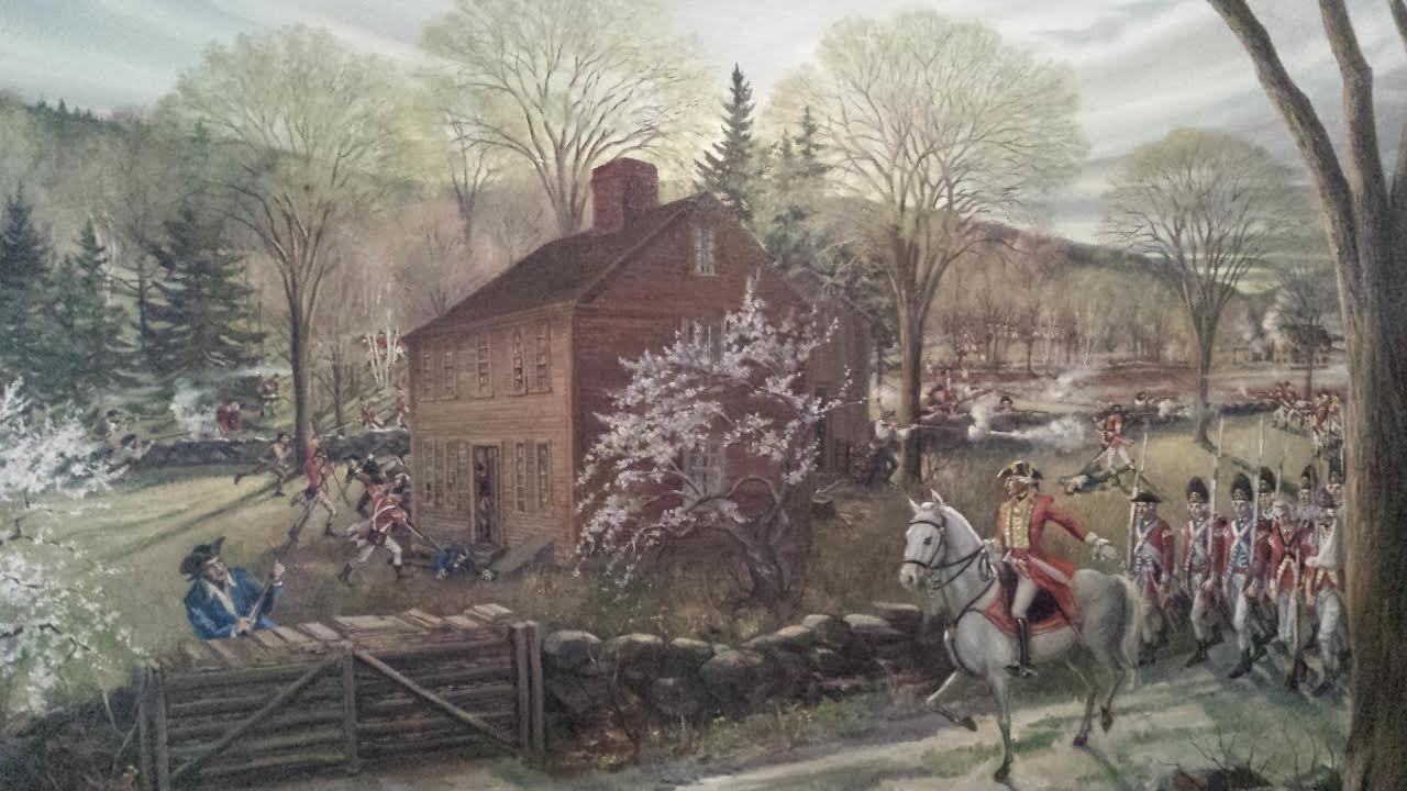 The Fight at the Jason Russell House, bicentennial painting by Ruth Linnell Berry (1974). Appearing with permission from the Arlington Historical Society.