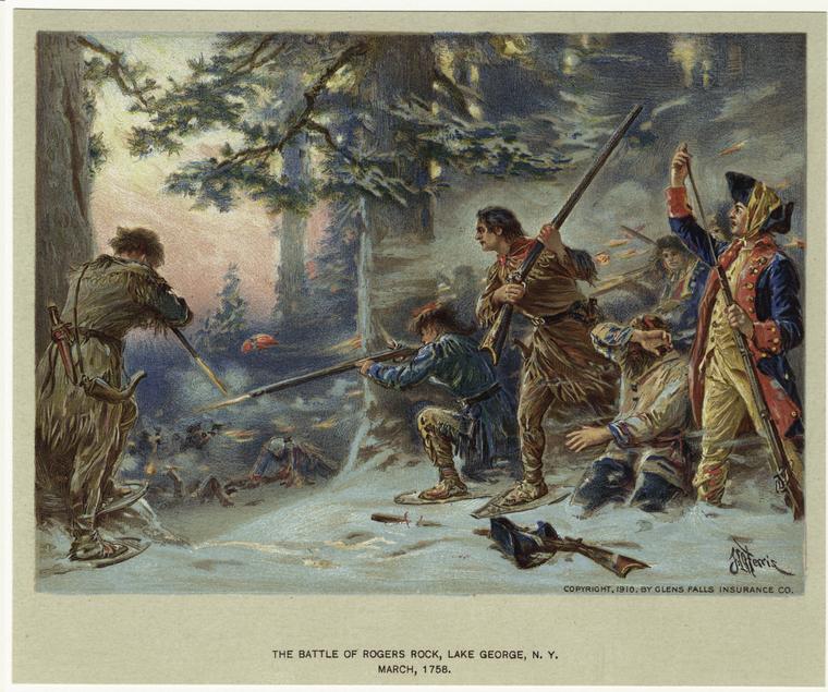 Rogers’ instincts were correct and as a 95-man patrol consisting mainly of natives entered the kill zone an ambush was triggered. The rangers initial volley killed and wounded many (Rogers reported 40 killed), with the survivors fleeing. Some of the rangers descended on the dead and wounded and began killing the wounded and scalping the dead. A large group of rangers chased the fleeing French and native survivors along Trout Brook and they ran head long into the main French and native force of about 200 led by the Canadian partisan fighter Ensign Jean-Baptiste Langy. Langy’s main party unleashed a devastating volley on the rangers killing outright upwards of 50 rangers. Within minutes the rangers were overwhelmed by the counterattack and faced annihilation. Rogers rallied his remaining force and began a close-range fighting retreat toward Lake George. The situation was growing desperate—Rogers had lost maybe half his force within a short time and men were continuing to drop under the relentless assault of the French and natives. As darkness fell, Rogers and what was left of his command scattered and made their way to a rendezvous on Lake George. Rogers’ escape is a mystery, but the legend is he slid down what is now known as Rogers Rock to the shore of the frozen lake. A couple days after the battle Rogers and what remained of his command made their way to Fort Edward. The rangers were decimated – only about 50 survived.